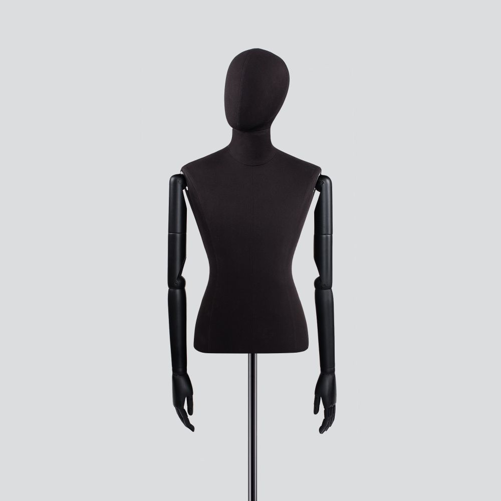 Ce mannequin de buste couture fonctionnera particulièrement bien dans les boutiques haut de gamme. Le bois, le lin fin et le noir intemporel ajouteront de l'élégance à l'étalage et inciteront les gens à visiter la boutique. Vous pouvez exposer le mannequin buste de couture avec des mains en bois en solo ou l'associer à d'autres torses de cette collection ou même à des mannequins complets de la série CLASSIC MODERN.