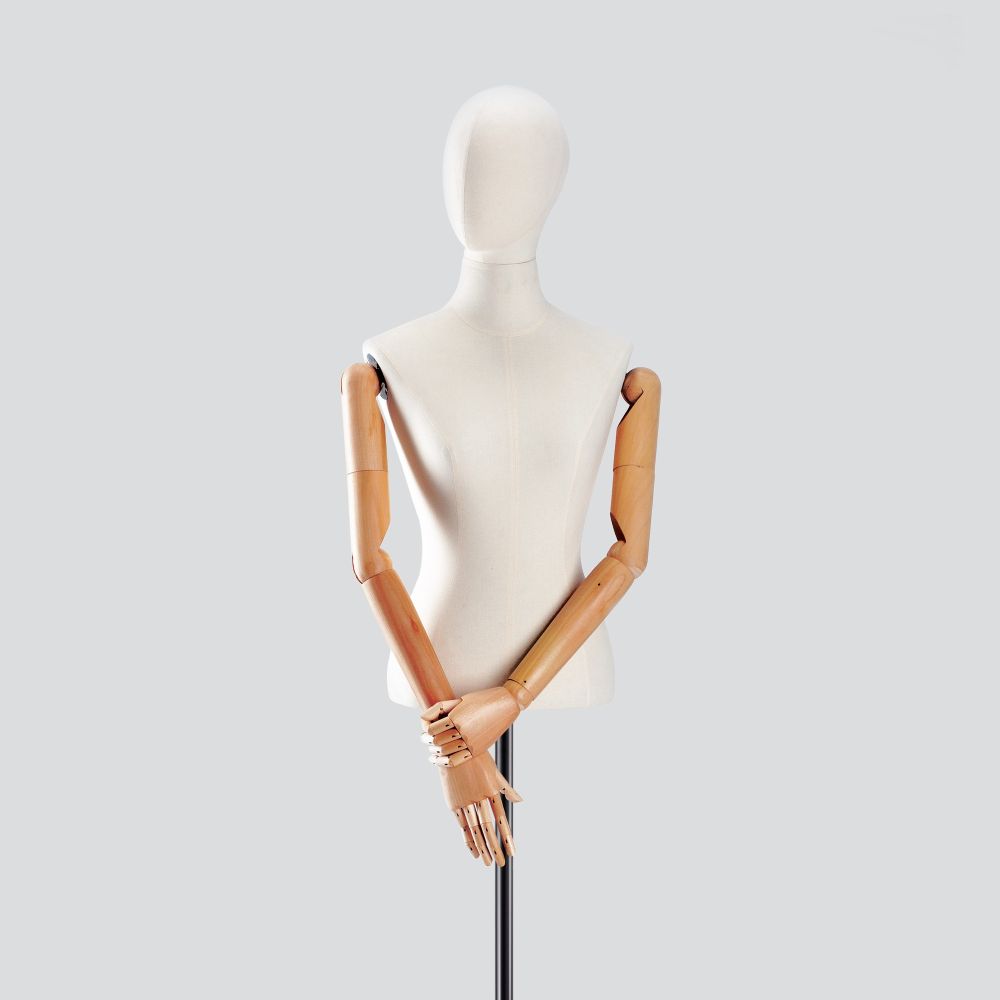 Ce modèle fonctionnera particulièrement bien dans les boutiques haut de gamme. Le bois, le lin fin et le noir intemporel ajouteront de l'élégance à l'étalage et inciteront les gens à visiter la boutique. Vous pouvez exposer le mannequin femme avec des bras en bois en solo ou le mêler à d'autres torses de cette collection ou même à des mannequins complets de la série CLASSIC MODERN.