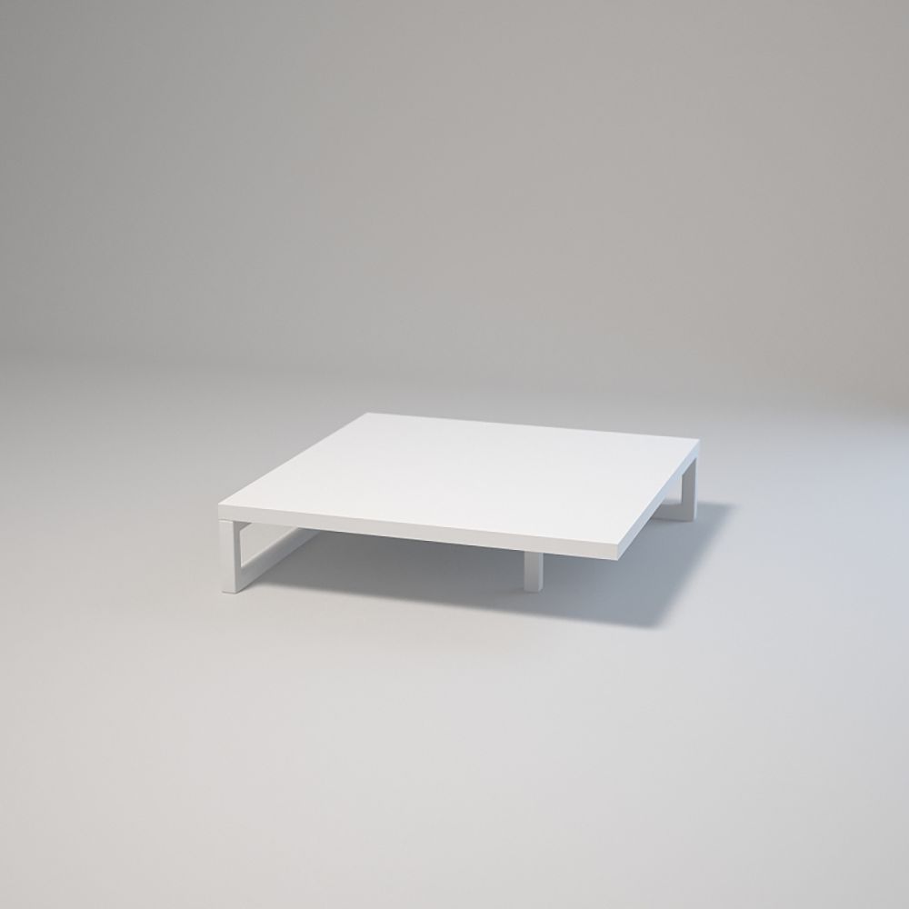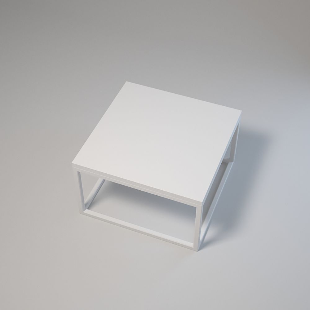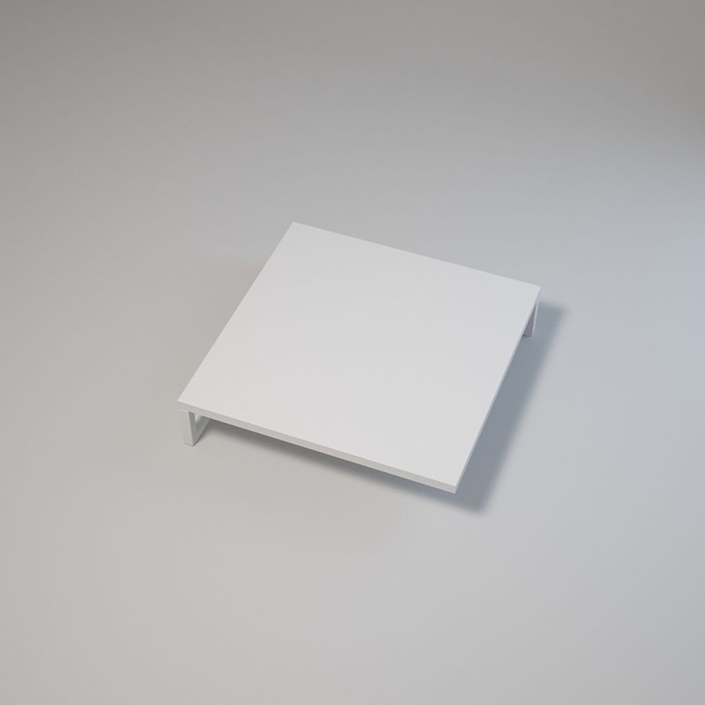 Dimensions : 50x50 cm, hauteur : 12 cm. Structure en acier thermolaqué 20x20x1,5 mm. Plateau stratifié avec chant. Montage par vis et douilles. Pieds réglables. Couleurs : blanc ou noir.