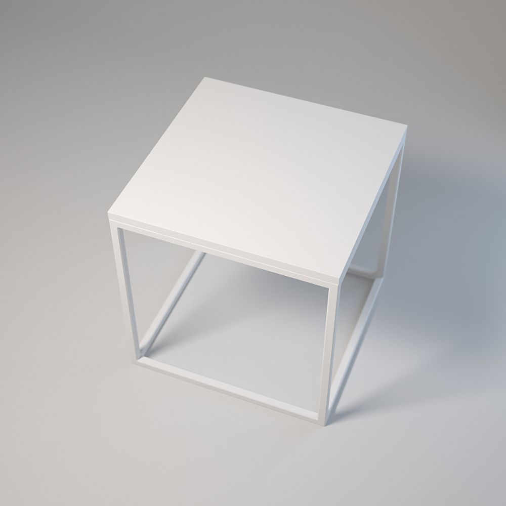 Dimensions : 50x50 cm, hauteur : 50 cm. Structure acier 20x20x1,5 mm thermolaqué. Plateau stratifié avec chant. Pieds réglables. Couleurs : blanc ou noir.