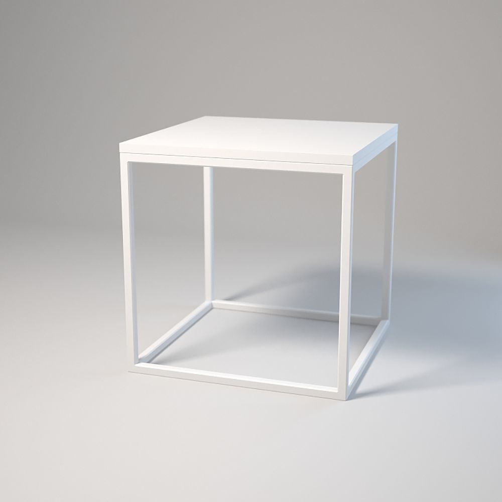 Dimensions : 50x50 cm, hauteur : 50 cm. Structure acier 20x20x1,5 mm thermolaqué. Plateau stratifié avec chant. Pieds réglables. Couleurs : blanc ou noir.