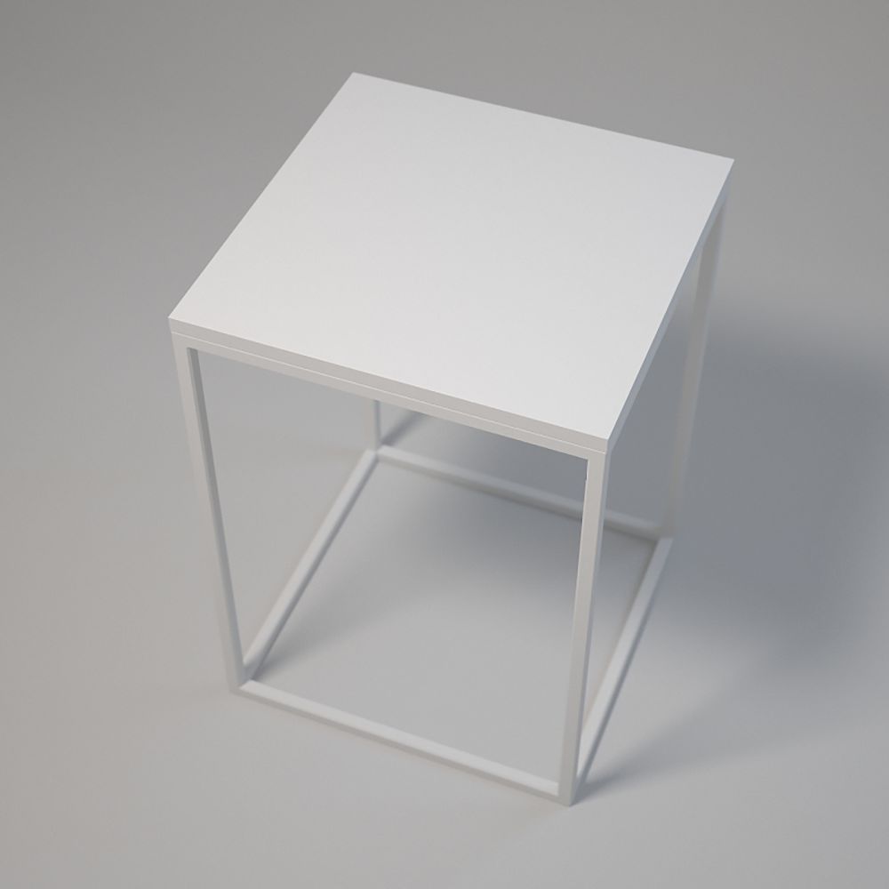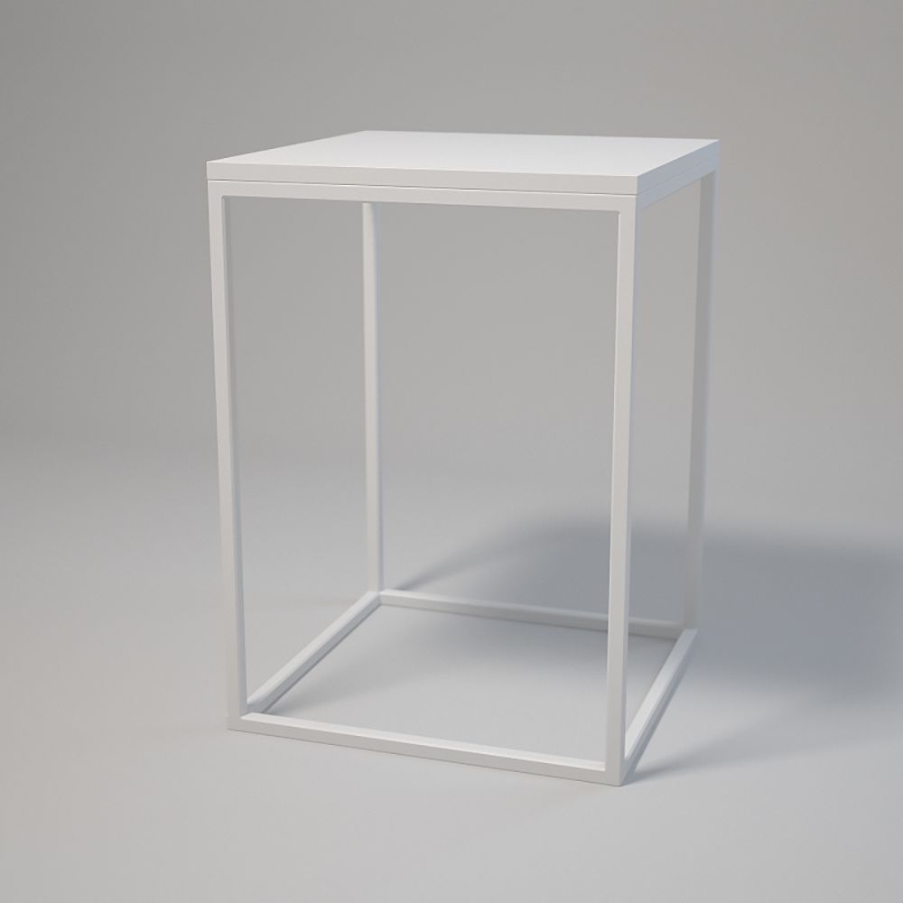 Dimensions : 50x50 cm, hauteur : 50 cm. Structure acier 20x20x1,5 mm thermolaqué. Plateau stratifié avec chant. Pieds réglables. Couleurs : blanc ou noir.