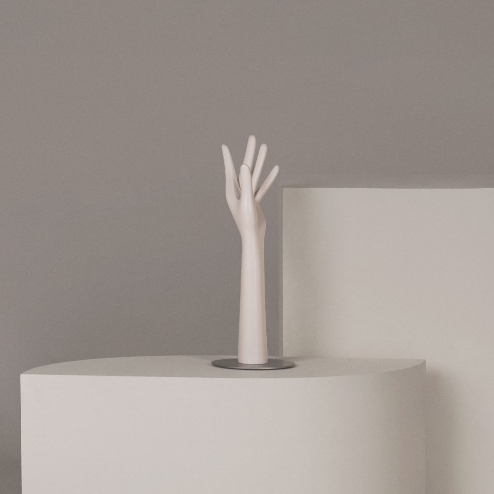 De facture esthétique, la main féminine élancée posée sur un socle métallique de couleur noire est un accessoire que vous pouvez placer sur un comptoir, une étagère ou dans une petite vitrine. Sa hauteur de quarante centimètres suffit à attirer l'attention des clientes qui visitent une boutique de mode ou une bijouterie. Le produit a été réalisé dans la couleur "vieille porcelaine", dont la teinte est similaire à celle d'un teint clair. Les bijoux présentés ont ainsi un aspect naturel et subtil.