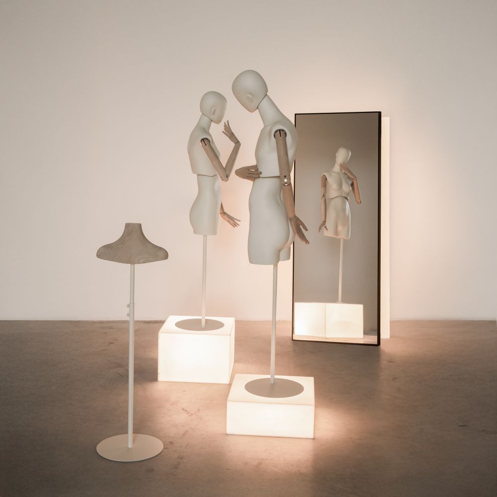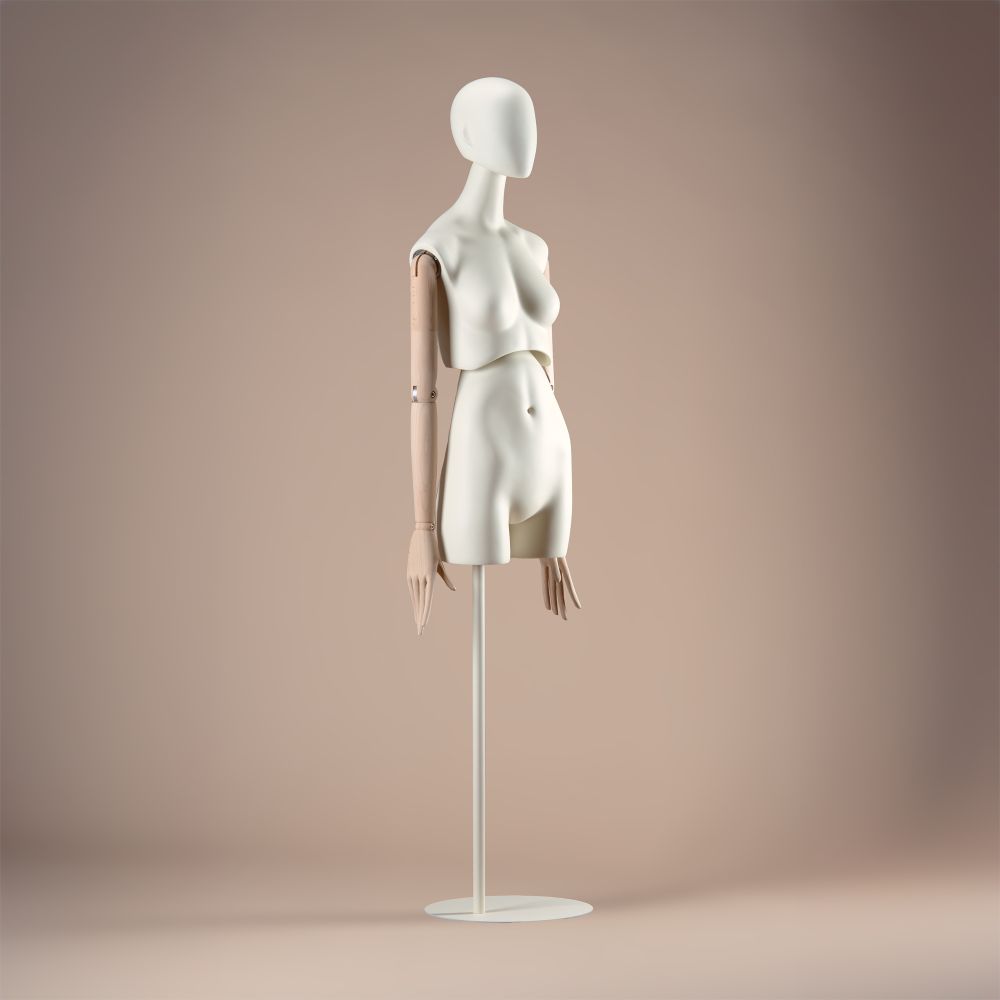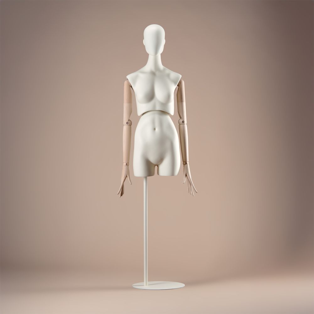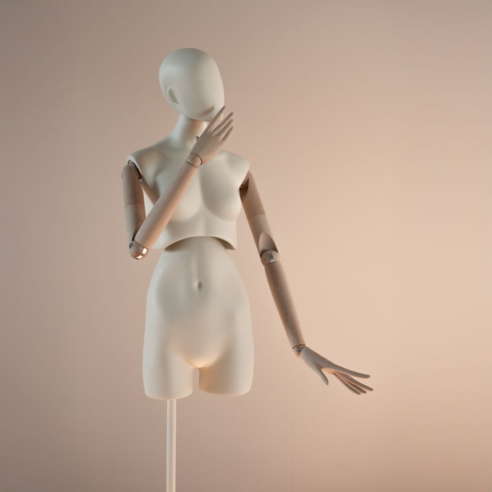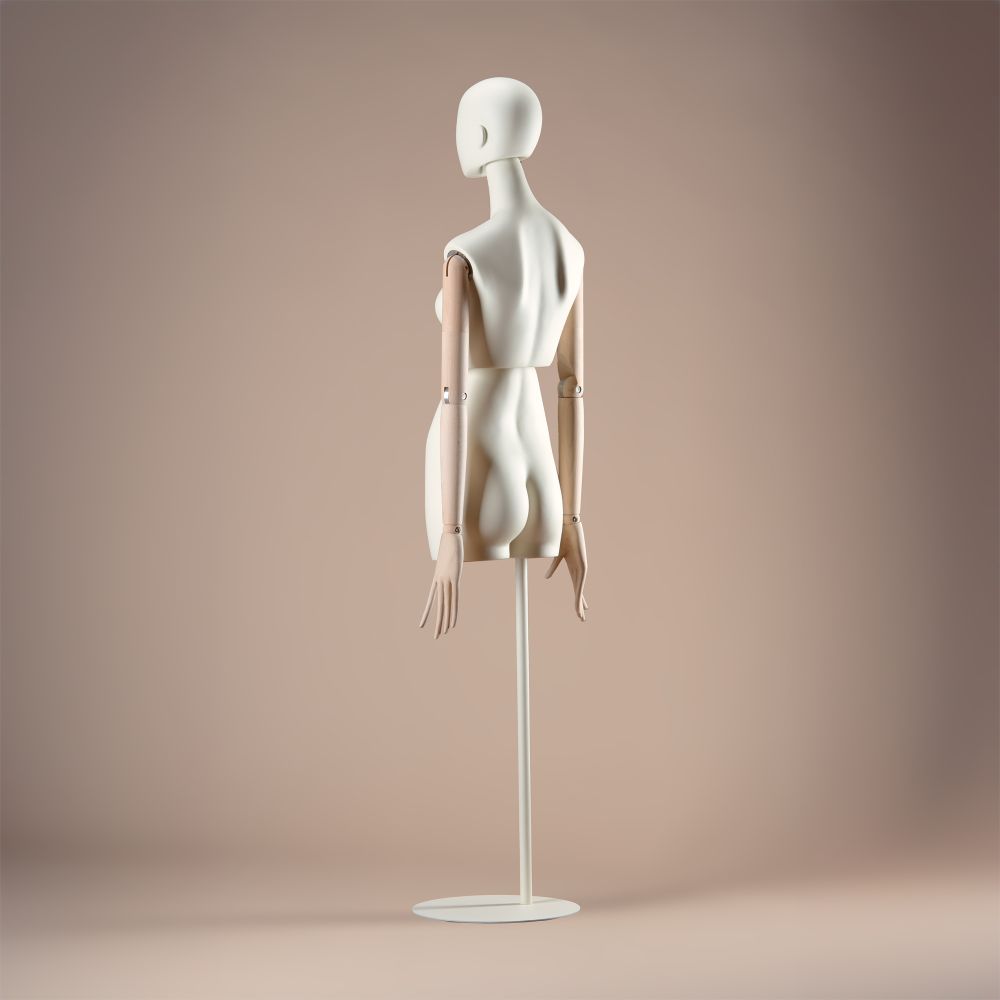 Le torse de mannequin de vitrine femme LUF-T est une solution moderne pour exposer des vêtements et accessoires. Son buste articulé peut pivoter et s’incliner, permettant un ajustement précis selon les besoins de la mise en scène. Ses bras en bois articulés ajoutent une touche d’élégance naturelle, tandis que sa base métallique stable, assortie à la teinte RAL9010 du mannequin, garantit une parfaite harmonie esthétique.